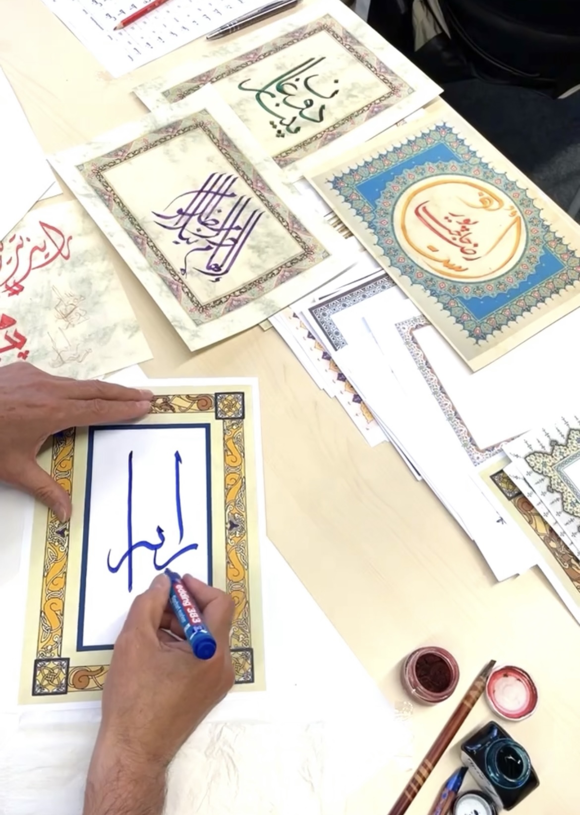 Umrahmt wurde das Programm von wunderschöner Kalligraphie, die interaktiv vor Ort von unserem geschätzten Kollegen Herrn Zuheir Elia MA dargeboten wurde. Zahlreiche Besucher ließen vor Ort ihren Namen zeichnen und durften das Kunstwerk dann auch als Souvenir mitnehmen, darunter auch der Dekan der Philosophischen Fakultät und Fachbereich Theologie, Herr Prof. Dr. Rainer Trinczek, der sich an der Kunst der Kalligraphie erfreute und von Prof. Hajatpour begrüßt wurde.