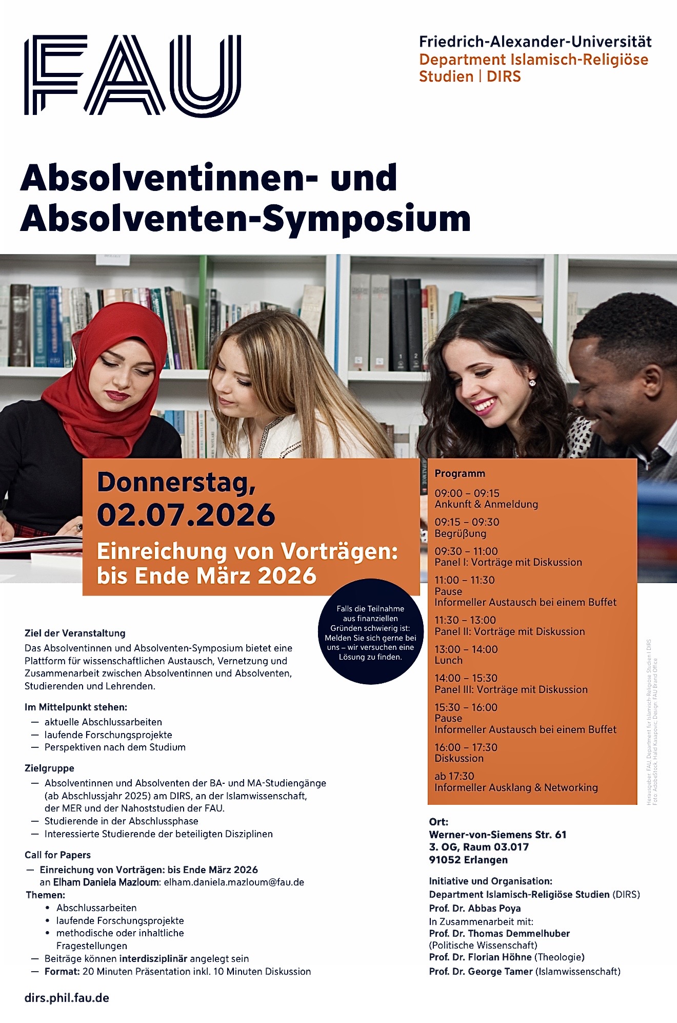 Am Donnerstag, den 02.07.2026, findet am Department Islamisch-Religiöse Studien (DIRS) der Friedrich-Alexander-Universität Erlangen-Nürnberg das erste Absolvent*innen-Symposium statt.
